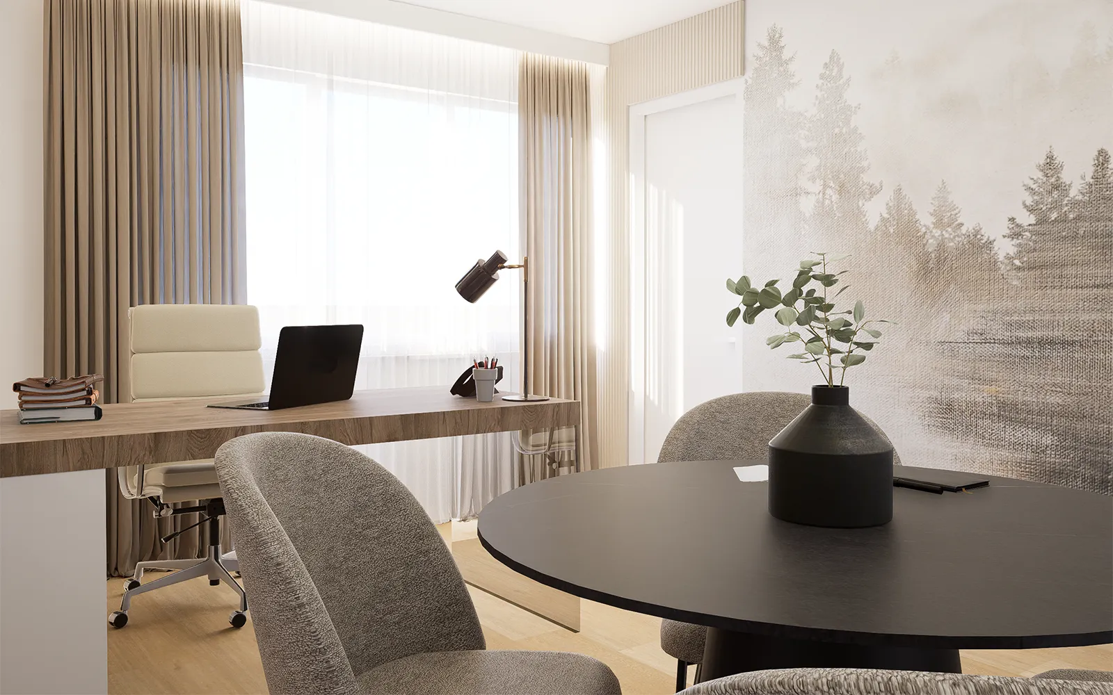 Tepih i elegantne stolice unose profinjenost u interijer. Osim toga zavjese i blackout dekori, naglašeni LED rasvjetom, stvaraju savršenu atmosferu za rad, čineći ovu prostoriju idealnim odabirom za dizajn ureda.